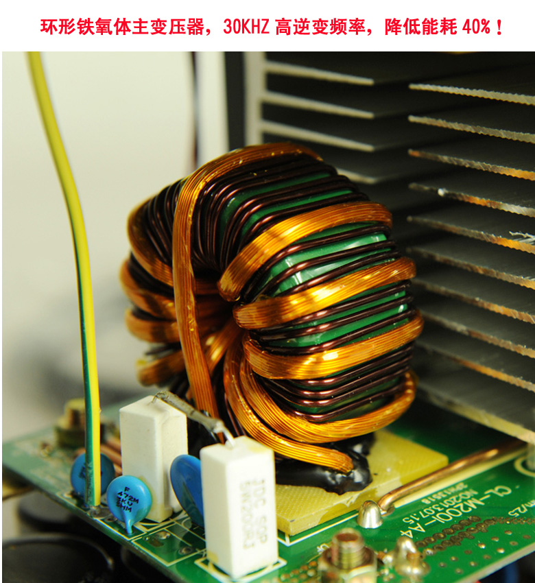 4、環(huán)形鐵氧體主變壓器,頻率為20-40KHZ,高效節(jié)能,減少了焊機(jī)的體積及重量;