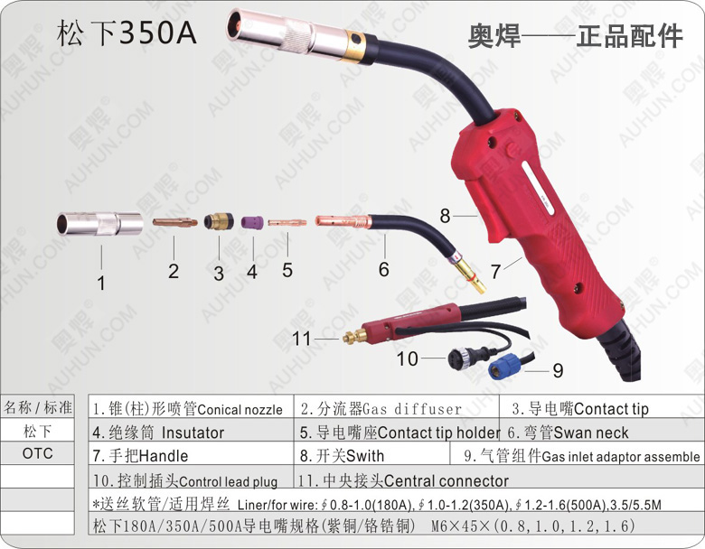 松下350A二氧化碳?xì)獗:笜?/strong>(氣冷式)適用于:250A-350A氣保焊機(jī)使用,暫載率60%時(shí)焊機(jī)電流350A,使用焊絲直徑:0.8-1.2MM,其他品牌:歐式、大電、濟(jì)南創(chuàng)菲美、原裝黑狼、諾斯款等(歡迎訂購)。